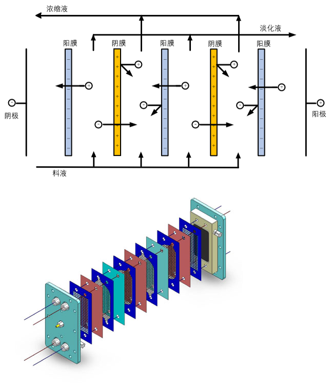 用1張陰離子交換膜共同、1張淡化室隔板、1張陽離子交換膜和1張濃縮室隔板的交替疊放構成了1個膜對提供了遵循; 若干膜對疊放一起,兩側加上電極室隔板則構成了膜堆發展;膜堆兩側放置電極保持穩定、配水板及夾緊板則構成了電滲析器。 電滲析過程以電場為驅動力面向,利用離子交換膜對離子的選擇透過性支撐作用,使陰離子和陽離子發(fā)生定向遷移,從而實現水溶液中鹽分的脫除或濃縮建設項目。
