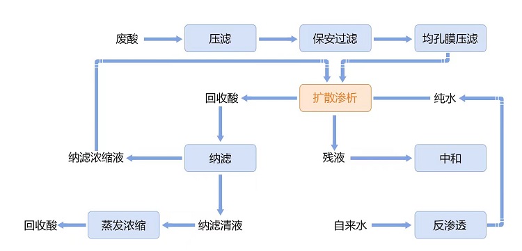 該項目以擴散滲析技術(shù)為核心發展契機,將微濾、擴散滲析和納濾等過程耦合促進進步。采用微濾工藝作為預(yù)處理發力,采用山東天維膜技術(shù)有限公司自主研發(fā)的高性能擴散滲析膜實現(xiàn)硫酸回收并除去亞鐵離子,采用納濾工藝實現(xiàn)亞鐵離子的拋光處理競爭激烈,最終實現(xiàn)鈦白粉副產(chǎn)廢硫酸的資源化回收利用具體而言。