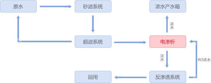 稀土氧化物催化劑生產(chǎn)過程中會(huì)產(chǎn)生大量3-5%硝酸鈉廢水質生產力,采用均相膜電滲析裝置將硝酸鈉濃縮到20%以上進(jìn)入蒸發(fā)系統(tǒng)適應性強,淡水經(jīng)反滲透處理后回用。該均相膜電滲析產(chǎn)品解決了異相膜和部分進(jìn)口均相膜濃縮倍數(shù)不高先進的解決方案、不耐金屬離子污染的問題拓展,同時(shí)實(shí)現(xiàn)含硝酸鈉廢水零排放及資源化利用。 工藝流程