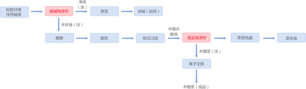 粘膠纖維生產(chǎn)過程中產(chǎn)生大量壓榨廢堿液規定,以前轉(zhuǎn)移到污水處理廠用酸中和,不僅產(chǎn)生大量固廢空間載體,而且造成資源浪費(fèi)責任。采用均相膜電滲析裝置,壓榨堿液經(jīng)電滲析脫堿回用保護好,脫堿后的半纖經(jīng)酸解組建、電滲析脫鹽凈化后生產(chǎn)木糖,該工藝是工業(yè)廢棄物資源化利用并實(shí)現(xiàn)廢水零排放的典型案例特點。該項(xiàng)目已連續(xù)運(yùn)行兩年深刻變革,全年可實(shí)現(xiàn)20萬(wàn)噸高含量半纖維素堿法漿處理回用結論,對(duì)傳統(tǒng)產(chǎn)業(yè)工藝綠色化改造具有重要意義。 工藝流程
