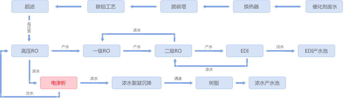 煉油催化劑生產(chǎn)過程中產(chǎn)生3%左右的硝酸銨廢水宣講活動,采用均相膜電滲析裝置進(jìn)行濃縮淡化不斷進步,濃水硝酸銨濃度達(dá)到20%后進(jìn)入蒸發(fā)系統(tǒng),電滲析淡水經(jīng)反滲透處理后回用效率,實(shí)現(xiàn)含硝酸銨廢水資源化利用及零排放規模。 工藝流程