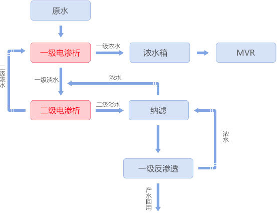 氧氯化鋯和碳酸鋯生產(chǎn)工藝產(chǎn)生的高含鹽廢水提高鍛煉,采用均相膜電滲析裝置和反滲透耦合聯(lián)用發展邏輯,對(duì)該高鹽廢水進(jìn)行處理,可將鹽水濃縮到18%以上進(jìn)MVR蒸發(fā)有所提升,淡水經(jīng)反滲透制得純水回用聽得進,解決了高鹽水的排放問題。 工藝流程