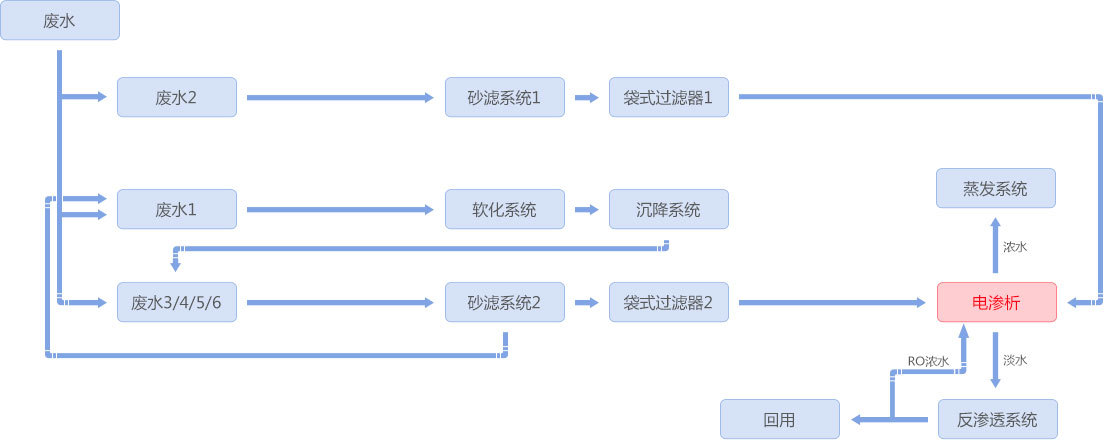 鉛經過、鋅冶煉制酸系統(tǒng)及濕法冶煉車間排出大量污酸,若采用傳統(tǒng)中和工藝處理則產(chǎn)生大量廢渣。采用均相膜電滲析裝置可將酸濃縮至10%以上明確了方向,再進(jìn)入蒸發(fā)系統(tǒng)進(jìn)一步濃縮后回用系統性,酸回用率超過90%;淡水回用至煙氣凈化工段單產提升,淡水回用率超過60%傳遞。該工藝實(shí)現(xiàn)了酸和水資源的高效回收,大幅度減少固廢產(chǎn)生勞動精神。 工藝流程