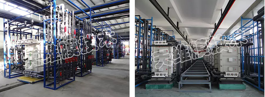 阻燃劑生產(chǎn)過程中產(chǎn)生低濃度含溴化鈉廢水體製,采用均相膜電滲析裝置構建,可將廢水中溴化鈉含量由1.5%濃縮至15%以上,然后再進(jìn)入蒸發(fā)裝置回收溴化鈉進(jìn)行銷售服務延伸,產(chǎn)出的淡水含鹽量降至0.1%可直接返回工藝循環(huán)利用共創輝煌。該工藝既降低了廢水處理成本,又實(shí)現(xiàn)了廢棄物的資源化回收利用研究。 項(xiàng)目現(xiàn)場(chǎng)